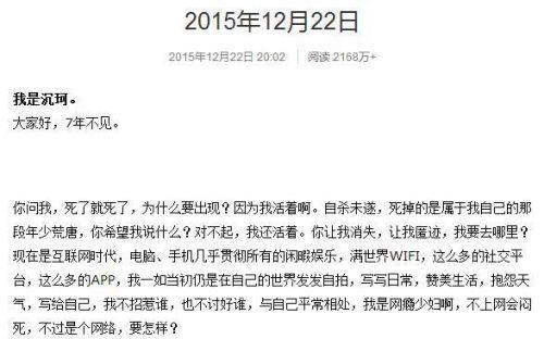 在沉珂消失好多年后一个一直被怀疑是陈珂本人的微博网友@幽灵木偶偶的这篇长微博,让好多人弹冠相庆:沉珂没死!沉珂回来了!