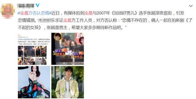 不久后金晨的工作人员就否认了二人的恋情,表示:“恋情不存在的,俩人一起在拍新剧,张超是男主,希望大家多多期待新作品。