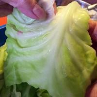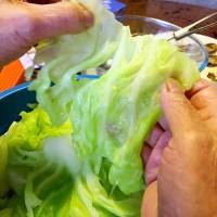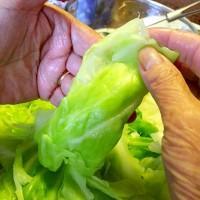 4.开始卷菜了,把中间的筋摘掉,用一半大叶子卷一个,用大叶子包碎叶子。