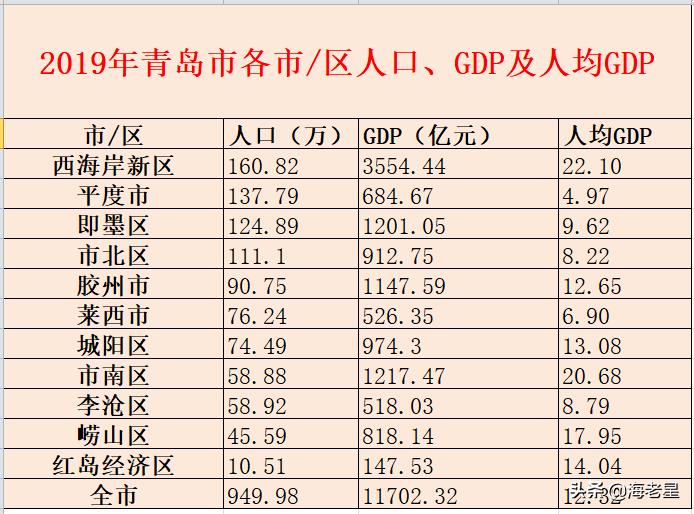 按市、区单独来看西海岸新区人均GDP最高,达到了22.1万元,最低的是平度市,只有4.97万元。