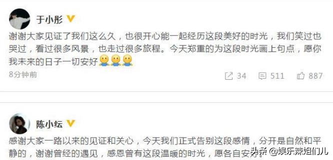 近日,31岁的女星陈小纭与26岁的于小彤在各自的微博账号宣布和平分手的消息。其实,对于陈小纭和于小彤如今分手的结局,我们并不吃惊,很多人都不看好陈小纭和于小彤的这对儿相差5岁的姐弟恋情。
