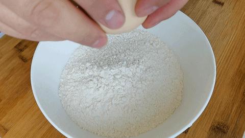 3.准备300克面粉,面粉中打入一个鸡蛋,顺着一个方向把面粉和鸡蛋搅拌开,使面粉形成一粒粒的面疙瘩,用鸡蛋拌的面疙瘩口感更劲道,营养也会更好。