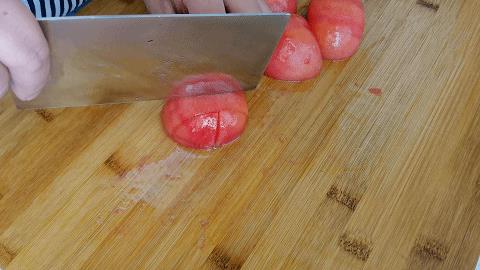 2.西红柿冷却后撕去外皮,再把西红柿切成小块。