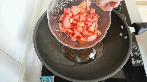 4.炒锅热锅后加入适量植物油,油热后下入西红柿,把西红柿多煸炒一会,把西红柿炒软,炒出汁水。