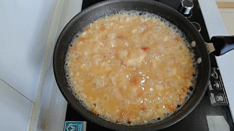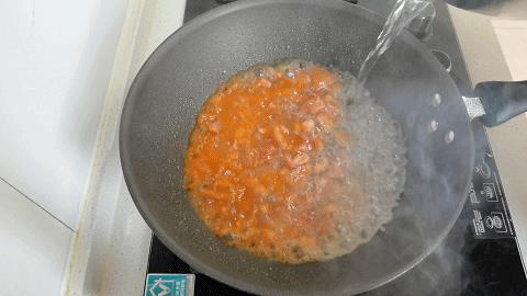 5.西红柿炒软后在锅内加入大量热水煮开。