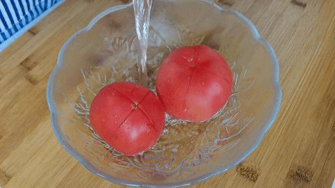 1.首先在西红柿上切十字花刀,放入碗中倒入开水,用开水烫去西红柿外皮。