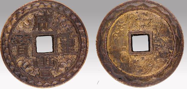 清·咸丰重宝宝苏当十去字龙凤刻花。直径:37.5mm ;重:34g,欧洲回流包浆,铜光可见,品相极佳。