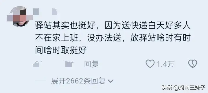有网友说;“驿站其实也挺好,因为送快递白天好多人不在家上班,没办法送,放驿站啥时有时间啥时取挺好。”