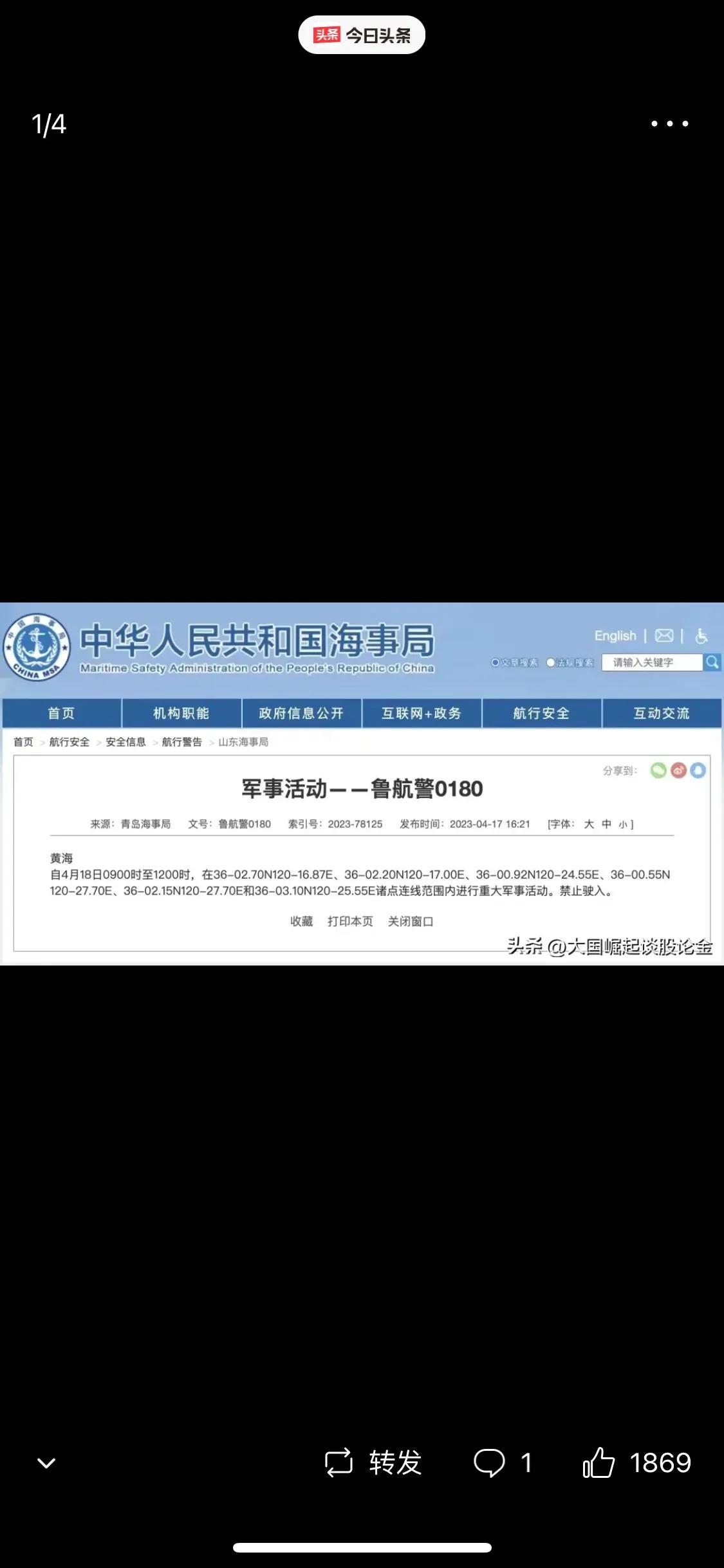一,山东海事局发布航行警告,在黄海海域内进行重大军事活动。注意,是军事活动不是军演!