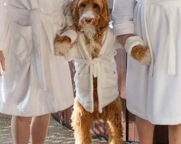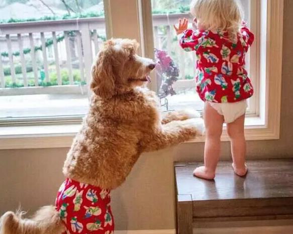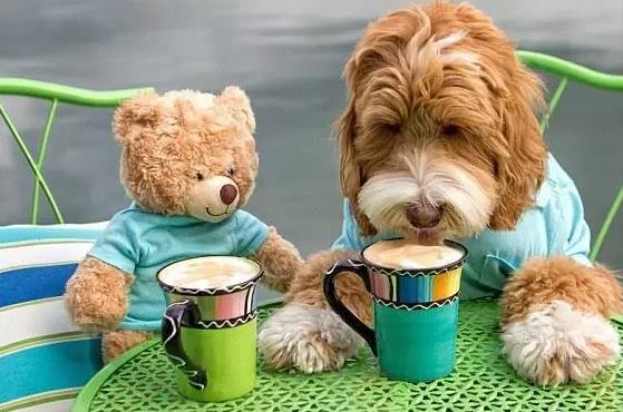 由于是拉布拉多和贵宾的混血,拉布拉多贵宾狗具有贵宾犬不掉毛的特点哦,Reagan特别喜欢自己的玩具熊,备受宠爱的里根和熊友一起享用下午茶,穿着一样服装的它们亲密无间。