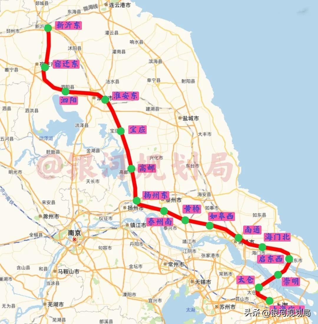 新沂东站→宿迁东站→泗阳站→淮安东站→宝应站→高邮站→扬州东站→泰州南站→黄桥站→如皋西站→南通站→海门北站→启东西站→崇明站→太仓站→上海宝山站。