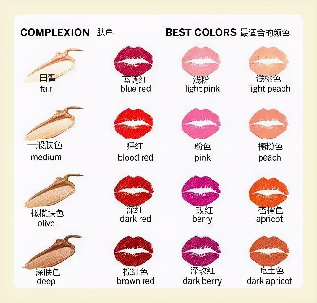 最近,网上流传着一张“口红与肤色匹配表”,由于该图是英文版本,所以本人翻译了一下(有些地方是意译),我们一起来看看吧!