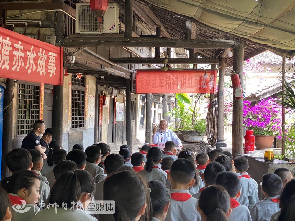 而此时,离太平渡渡口不远处的太平古镇老街上,75岁的胡敬华正在给古蔺第一小学五年级5班的孩子,讲红军长征四渡赤水的故事。“苦不苦,想想长征二万五。”在老屋门前的空地上,一张四方桌,十排条凳,临时搭建的“教室”里,学习氛围浓厚。满头白发的胡敬华讲到动情处唱起赤水河船工号子,声如洪钟,号子里融入了红军开仓分盐的故事。