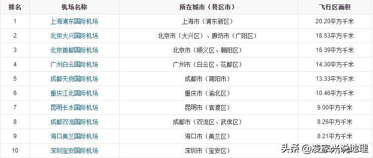 中国民用运输机场飞行区面积十大机场示意图