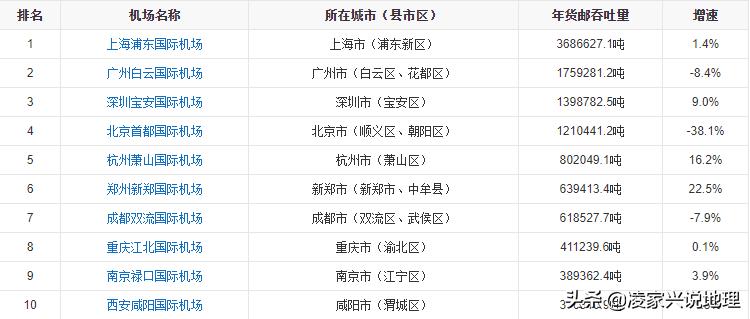 2020年,中国241座颁证民用运输机场年货邮吞吐量排名前十的机场名单(数据)如下表所示: