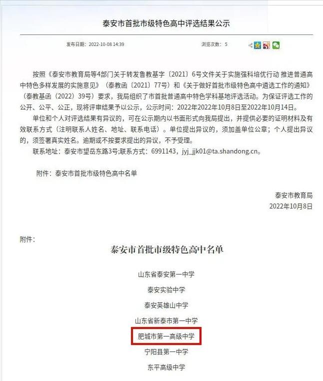 肥城市第一高级中学被评为泰安市首批市级特色高中