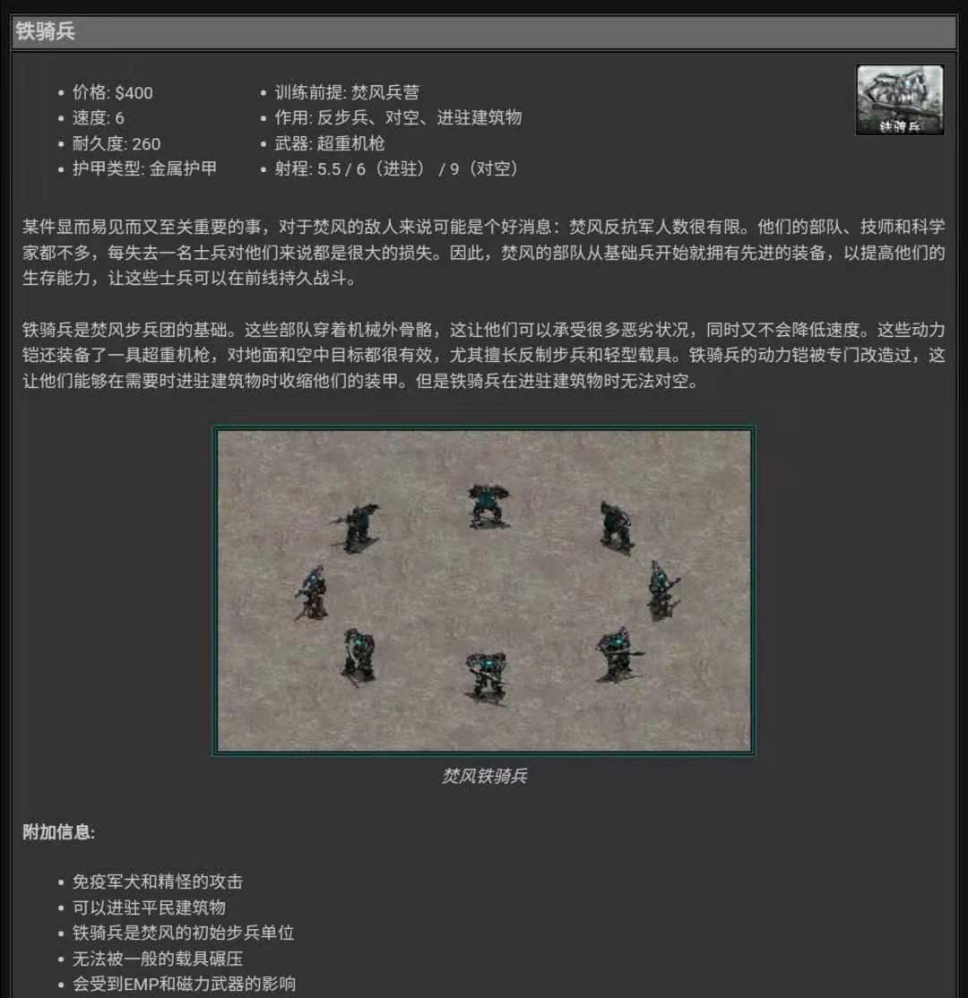 焚风阵营的军队数量有限,所以每一个士兵装备精良。焚风铁骑兵装备了一台外骨骼机甲,防护甲是金属护甲,这就造就了焚风铁骑兵的生存能力强悍,一般的坦克还无法碾压铁骑兵。焚风铁骑兵的武器很厉害,他们装备一挺超重型重机枪,这就造就了铁骑兵打步兵和轻型装甲部队很轻松,而且他们还有别的阵营基础步兵无法做到的事情防空,焚风铁骑兵可以防空,同时还不怕被军犬攻击,所以仔细一看400单位资金性价比还可以。(我试过焚风铁骑兵打步兵是真的猛)