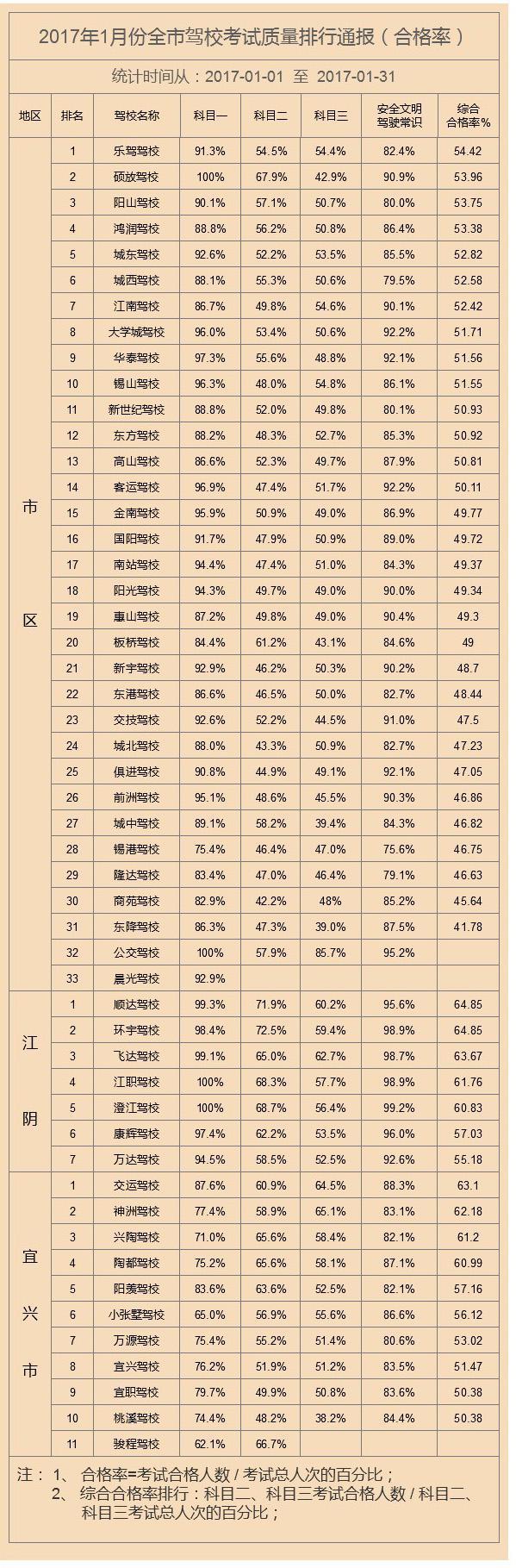 2017年无锡1月份驾校考试质量排行通报(合格率),有了这份指南,麻麻再也不用担心我考驾照不过啦!