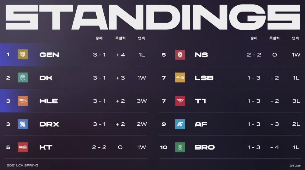 从现在的积分榜可以看到,如今LCK赛区依然是几支队伍遥遥领先,GEN、DK、HLE、DRX都是拿到了3-1的战绩,只是因为小分方面略有差距,所以排名有所差别。