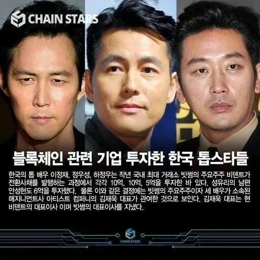 姜宗贤投资Block Chain,有三位韩国巨星,李政宰,郑雨盛和河正宇都跟着投了他的公司,分别投资了10亿韩元,10亿韩元,5亿韩元,而成宥利老公也投资了6亿韩元。