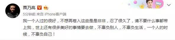 “我一个人过的很好,不想再卷入这些是是非非,忍了很久了,请不要什么事都带上我,世上还有很多美好的事情要去做,不辜负别人,不辜负生活,一个人的时候,不辜负自己!”
