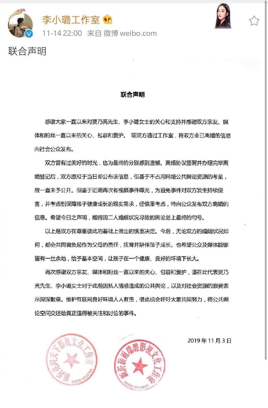 声明里说,原拟于离婚登记当日公布该信息,但基于不占用网络公共舆论资源的考量,故一直未予公开。