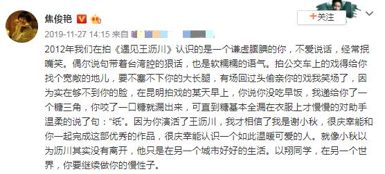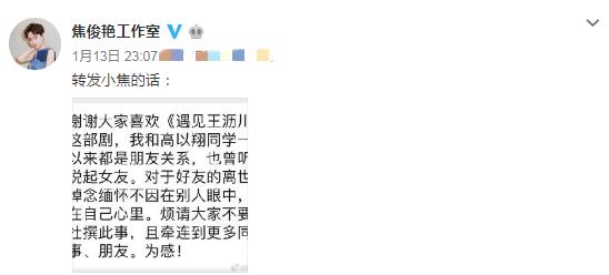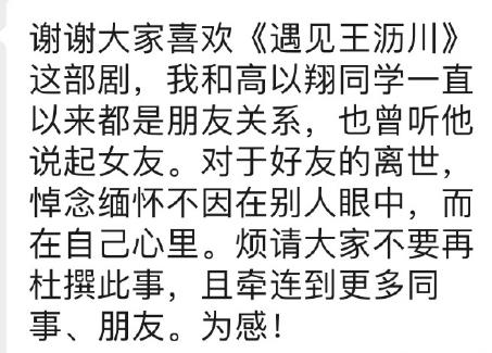 焦俊艳写道:"谢谢大家喜欢《遇见王沥川》这部剧,我和高以翔同学一直以来都是朋友关系,也曾听他说起女友。对于好友的离世,悼念缅怀不因在别人眼中,而在自己心里。烦请大家不要再杜撰此事,且牵连到更多同事、朋友。为感!"