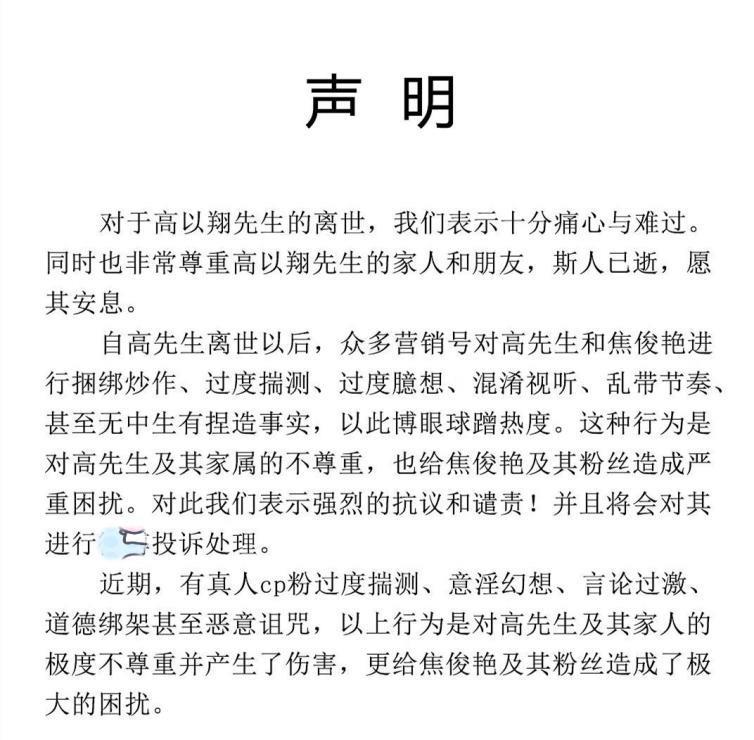 1月13日,饱受困扰的焦俊艳发声澄清自己与高以翔的关系,表示与高以翔只是朋友关系,并恳请大家不要杜撰,牵连他人。