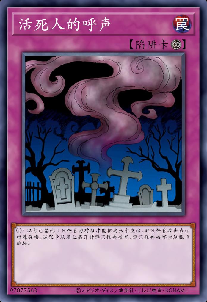 不过即便是进入了同调时代,整个游戏王的环境都在疯狂加速,但是「死者苏生」的效果之强力,对于这个时代来说依然还是太超前了一些。所以在小黑屋外快乐的生活了两个卡表的「死者苏生」,终于又在2009年的9月表中再次被关进了小黑屋。到这个时候,早期能够从墓地召唤怪兽的3张神卡「死者苏生」「过早的埋葬」以及「活死人的呼声」,就只有「活死人的呼声」还活在小黑屋的外面,而且还是被限制1张的状态。