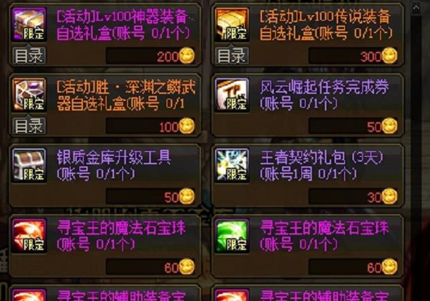 除了在寻宝图中的点亮格子获得的奖励之外,玩家们还可以通关硬币在商店中兑换线管的奖励,这些奖励包括100神器装备自选礼盒1个、.100级传说装备自选礼盒1个、新buff换装毕业武器一个、风云崛起任务完成券,也就是PK场的tp点任务完成券,另外还有一些附魔宝珠和一个银质金库升级工具,和一些契约礼包。