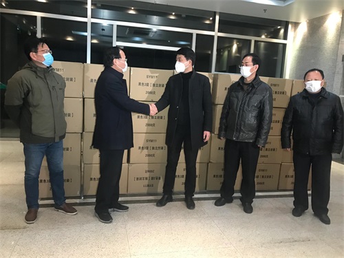 图三:曼迪新董事长王旭(左三)向市疫情防控指挥部捐赠物资