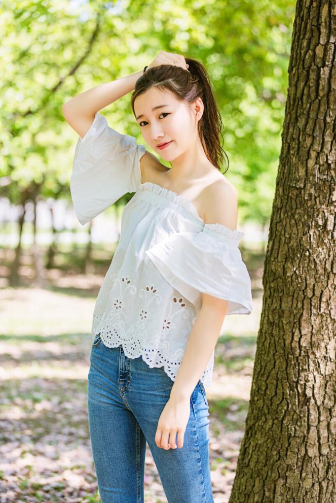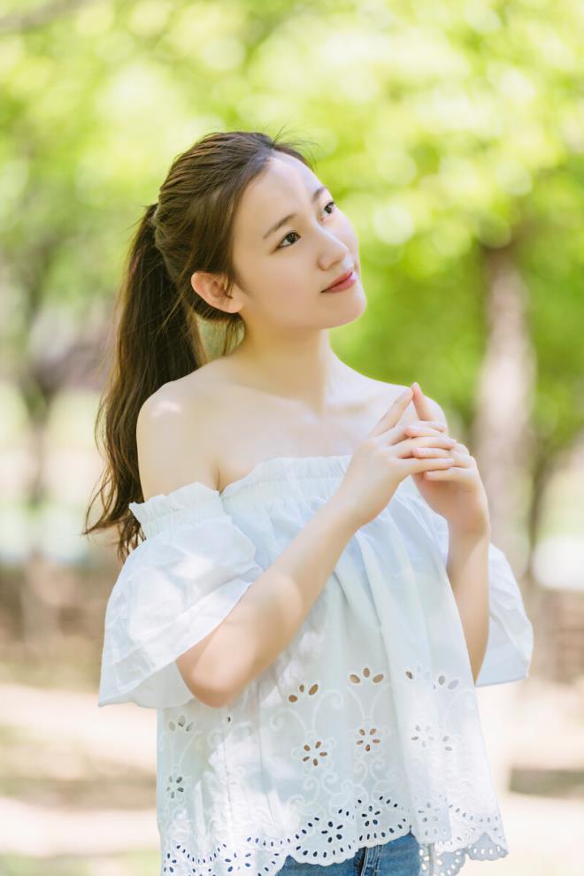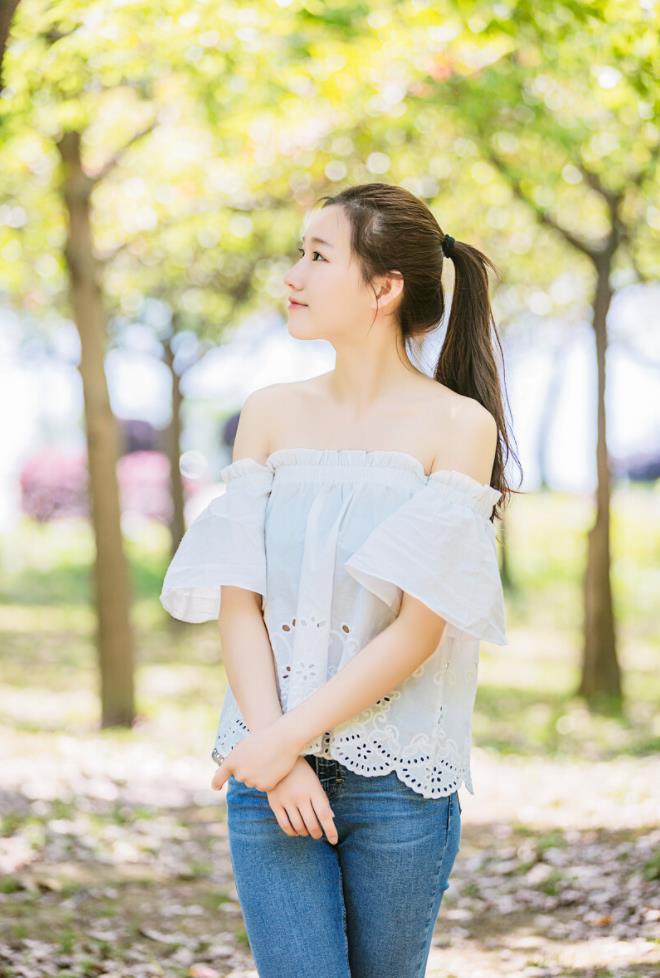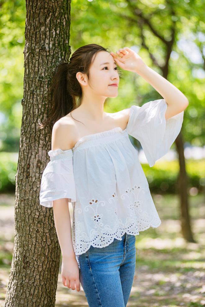 拍户外人像,因为是在户外拍摄的原因,难免会有看镜头尴尬的经历,所以,可以让自己摆拍一个假装害羞,不敢看镜头的姿势,手指可以害羞戳在一起,很调皮可爱。