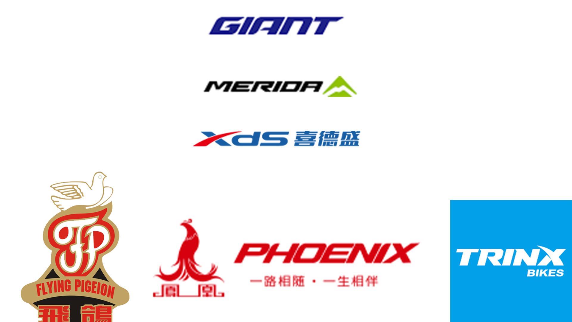 捷安特(Giant)、美利达(Merida)、喜德盛(Xds)、飞鸽(flyingpigeon)、凤凰(Phoenix)、千里达(Trinx)。