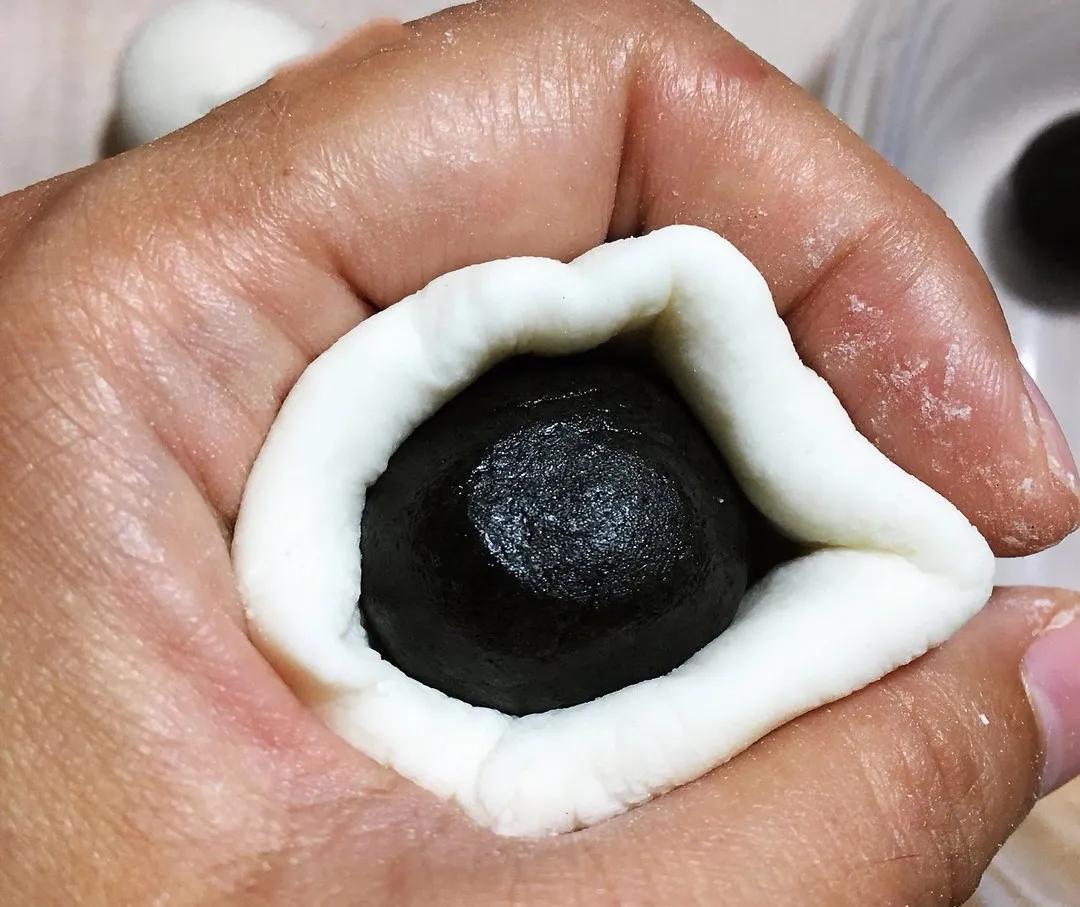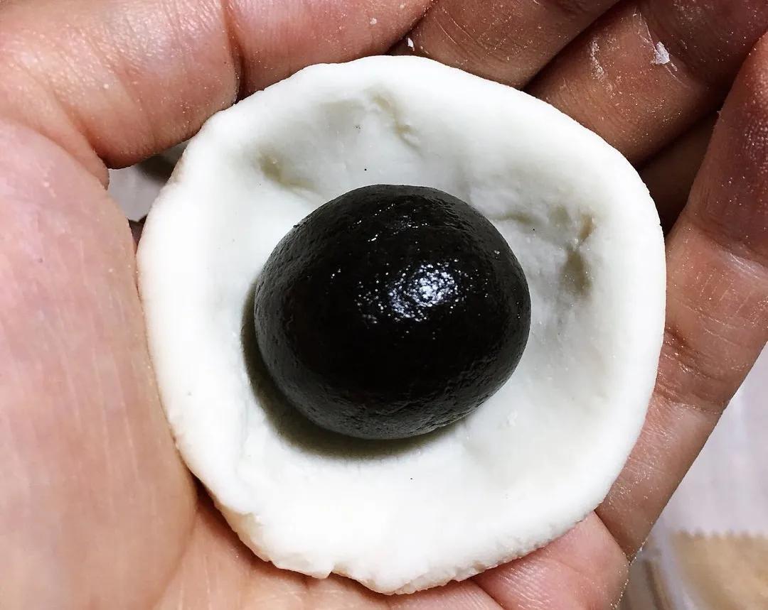 糯米团捏成小碗状,包进入一个黑芝麻团。