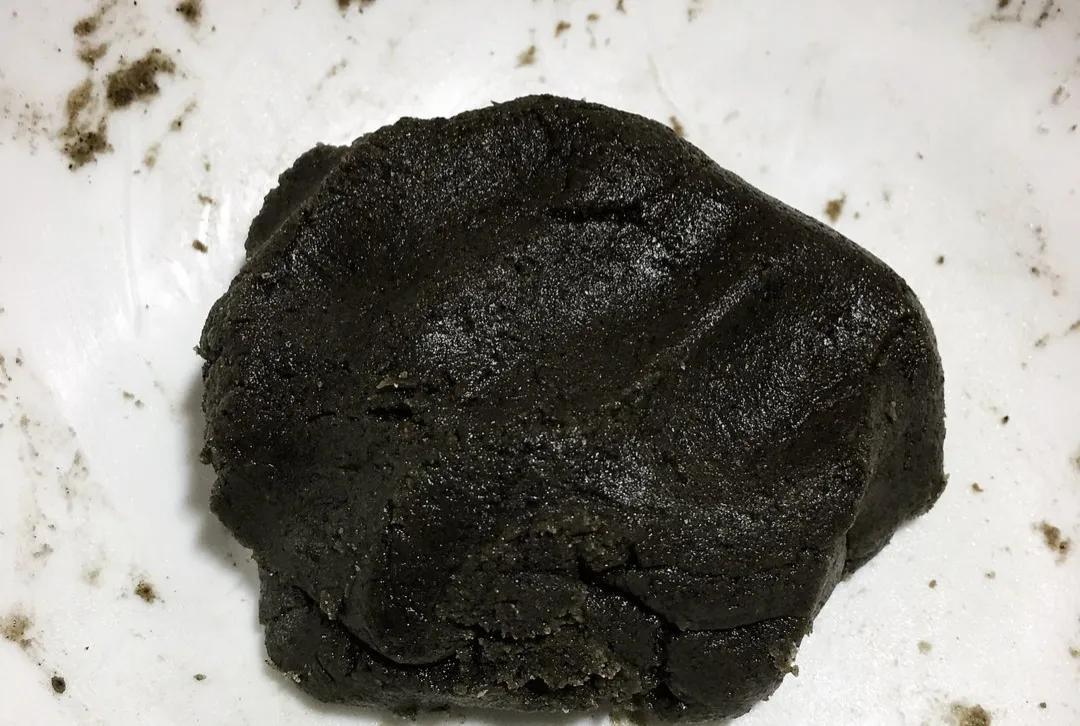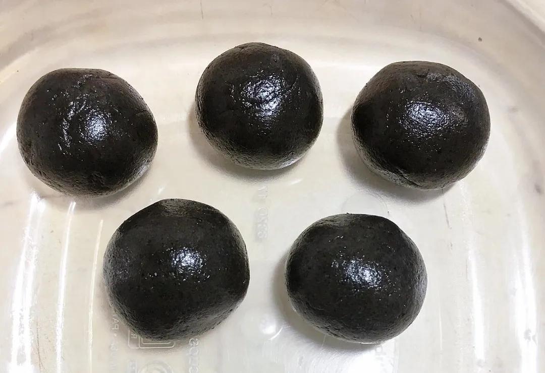首先在黑芝麻糊里放一点点开水,搅拌成比较干的粉团,再揉搓成圆球。
