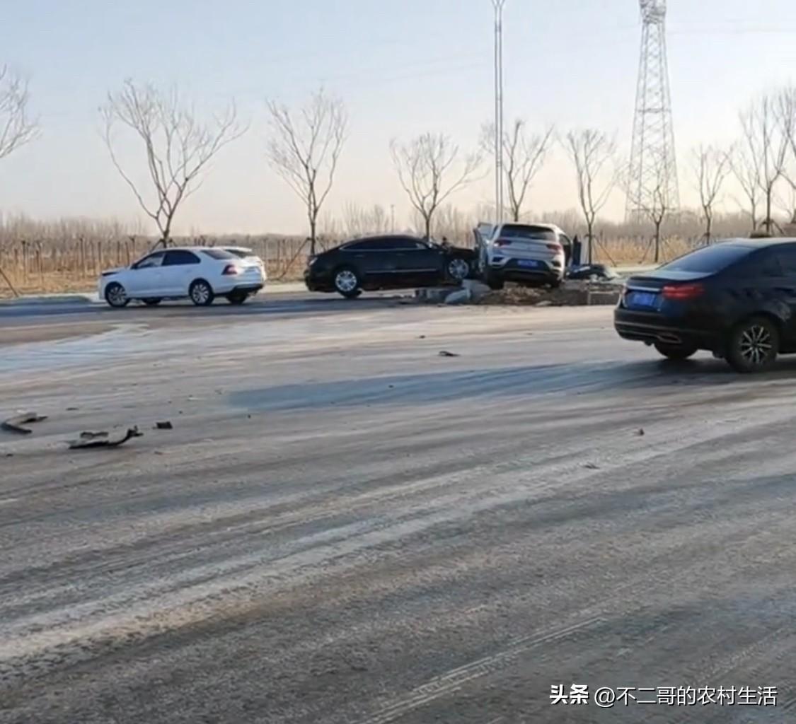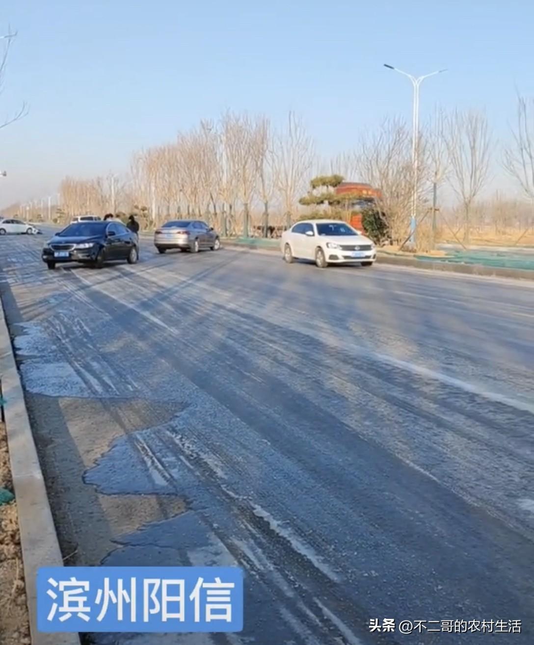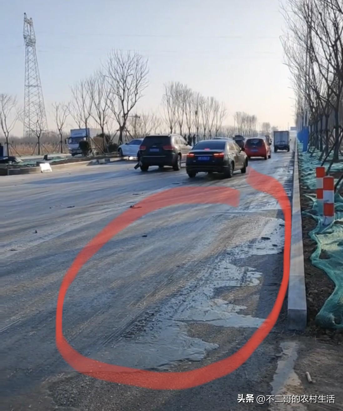 车祸路段的路面上,竟然有大量的非常均匀的一层厚冰!