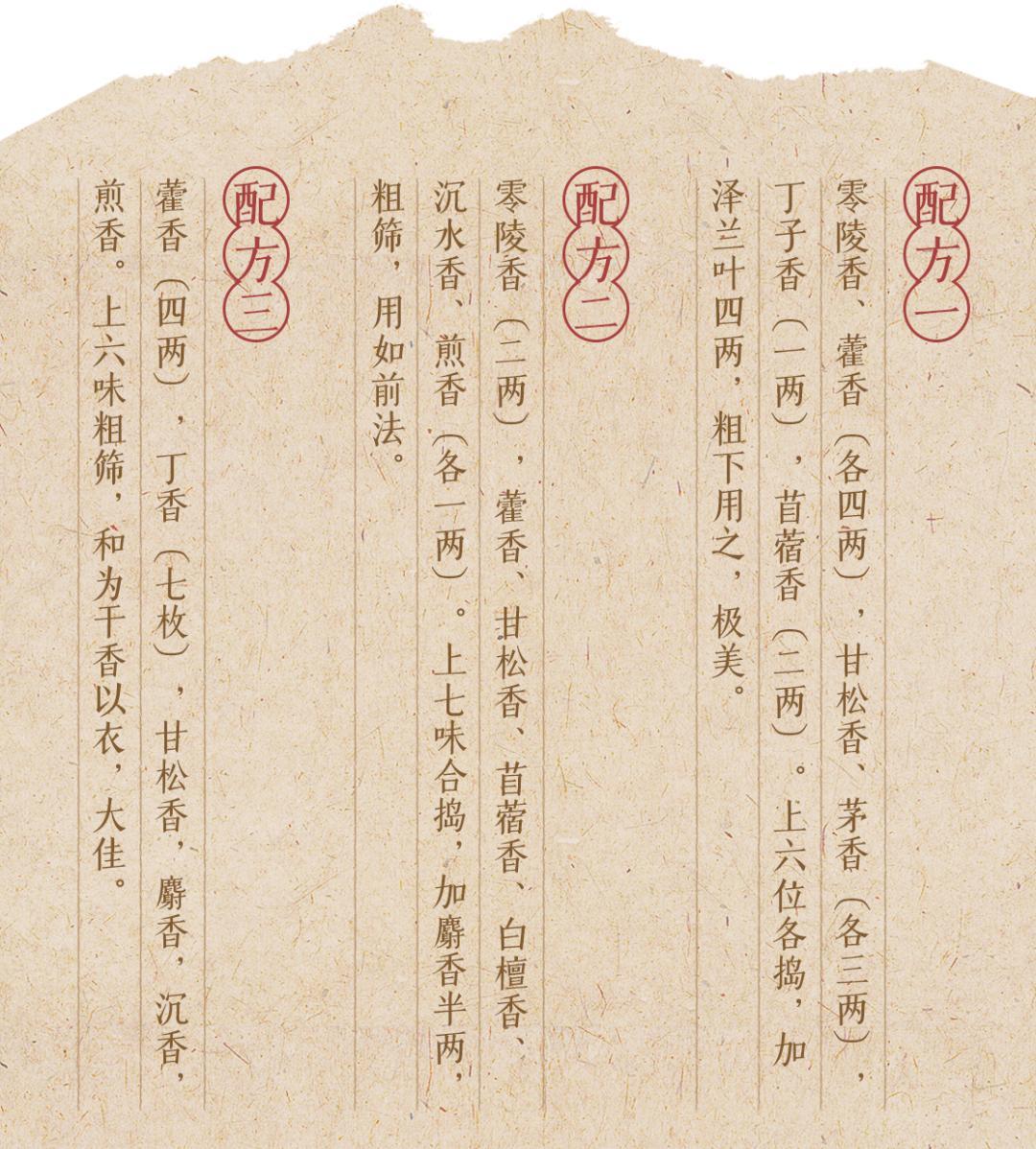 那么在历史的长河上,真的存在欢宜香吗?网上的回答众说纷纭,实际上最接近真相的回答可能是没有或者不知道,因为在古书上并没有此类合香的记载。虽说没有配方与之完全相同的香方,查阅文献却发现有异常相似的香方,那就是《备急千金方》中的衣香方。此种衣香方共有三种配方,如下所列: