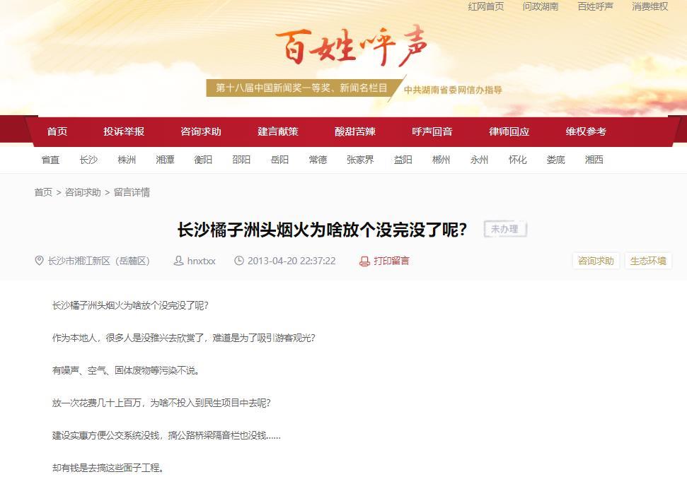 烟火虽然成为了长沙文旅的一张名片,但是也有市民觉得烟花扰民,担忧燃放烟花可能会对长沙空气质量造成一定影响。