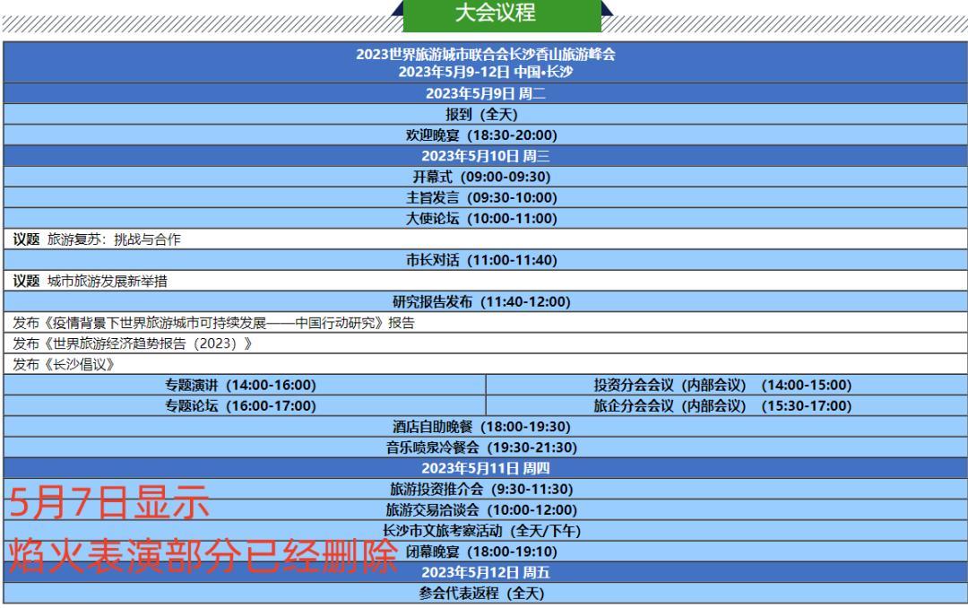 那么问题来了,5月11日,长沙会有烟花吗?可是现在世界旅游城市联合会官网显示2023世界旅游城市联合会,长沙香山旅游峰会的大会议程里焰火表演部分已经删除。