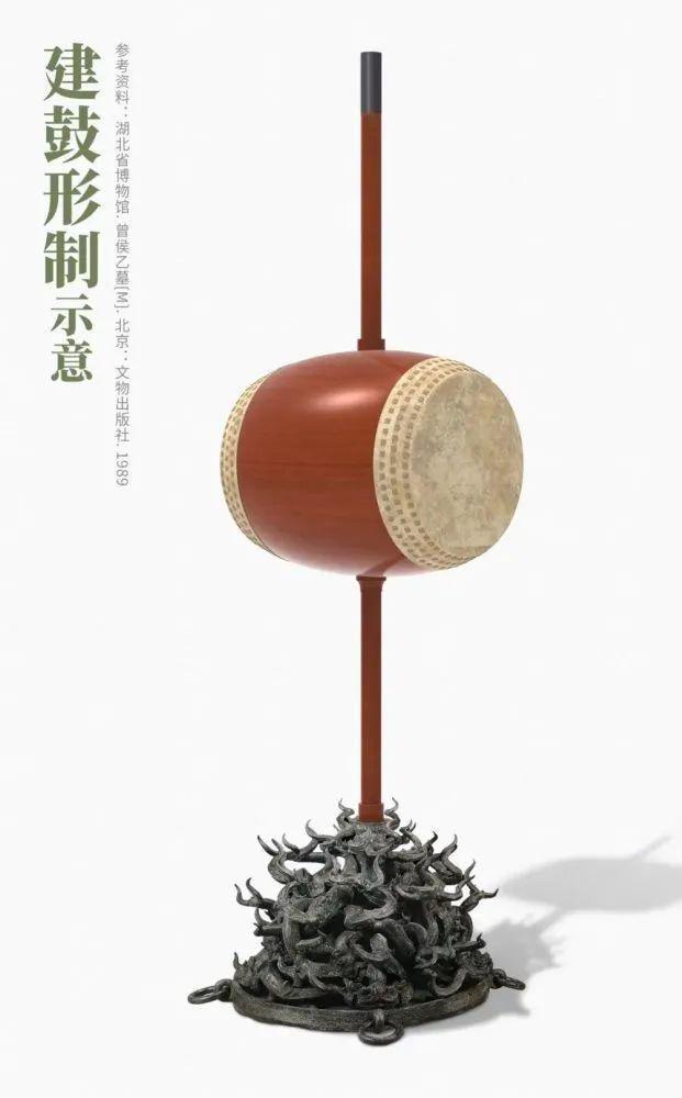 建鼓体积最大、离宴席最近,是整个乐队最主要的鼓,它以长木柱贯穿鼓腔后插于底座之中,鼓面为皮革、鼓身为枫木、鼓座为青铜。