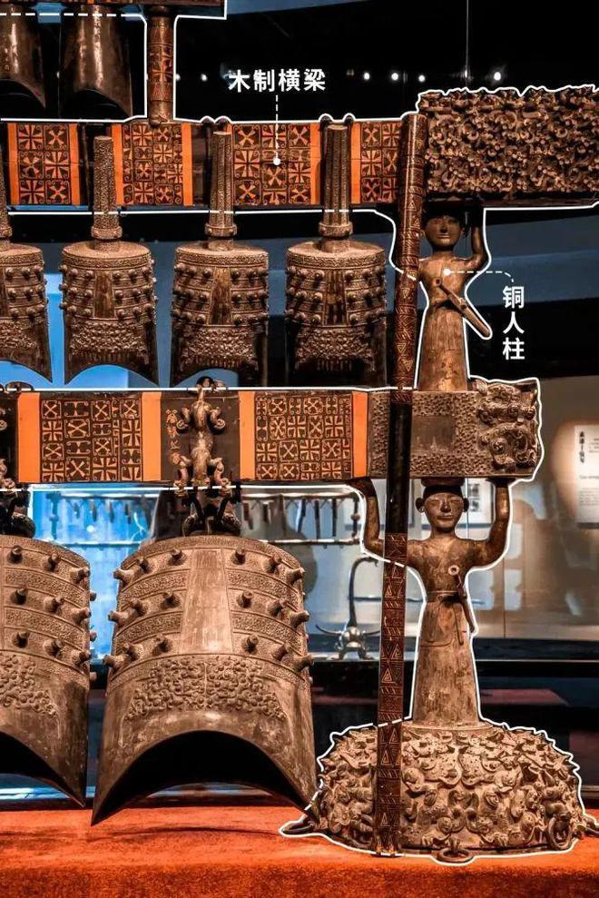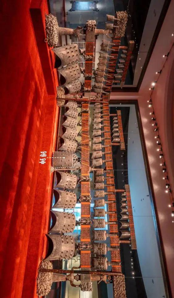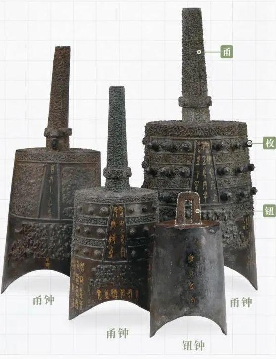 编钟分为三层悬挂,上面是钮钟,中层是甬钟,下层也是甬钟。