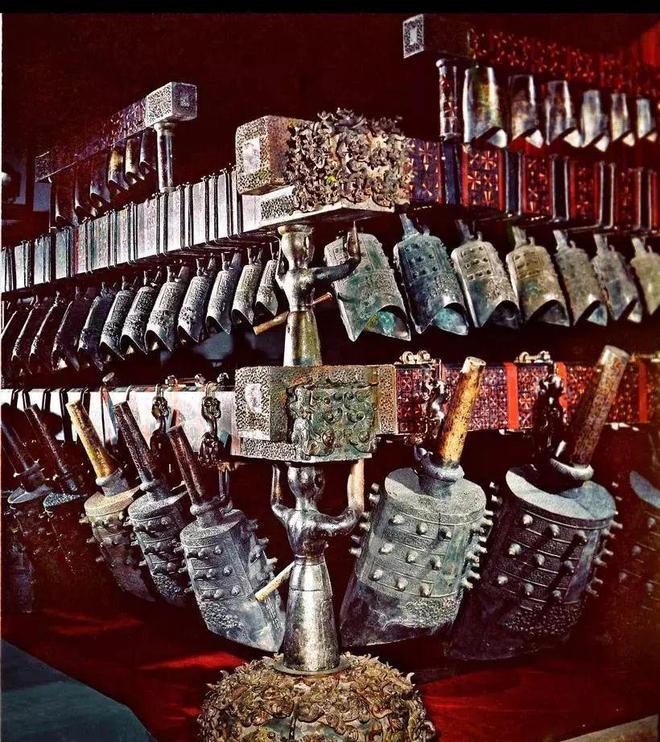 战国曾侯乙编钟钟架长748厘米,高265厘米,全套编钟共六十五件,分三层八组悬挂在呈曲尺形的铜木结构钟架上,最大钟通高152.3厘米,重203.6千克。它用浑铸、分铸法铸成,采用了铜焊、铸镶、错金等工艺技术,以及圆雕、浮雕、阴刻、髹漆彩绘等装饰技法。每件钟均能奏出呈三度音阶的双音,全套钟十二个半音齐备,可以旋宫转调。音列是现今通行的C大调,能演奏五声、六声或七声音阶乐曲。
