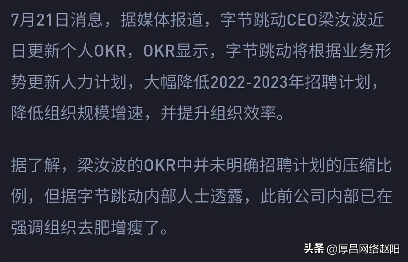 类似的还有字节跳动,CEO梁汝波称,将根据业务形势更新人力计划,大幅降低2022-2023年招聘计划,降低组织规模增速,提升组织效率。