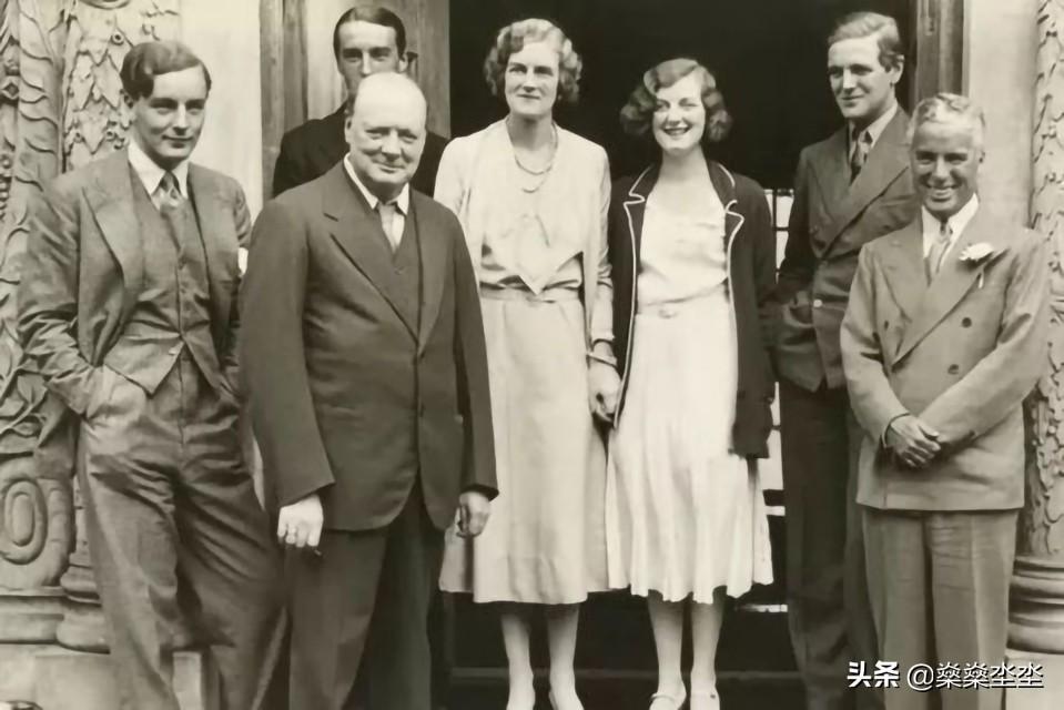 丘吉尔夫妇与二女儿莎拉,儿子伦道夫和查尔斯·卓别林