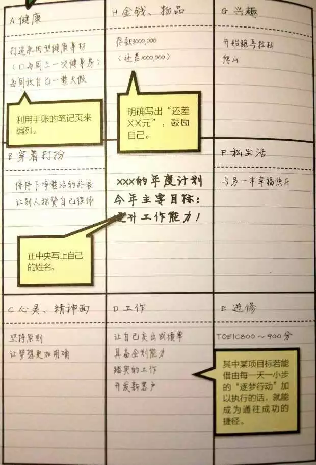在年计划中,可以把目标分为4大类:工作目标、健康目标、学习目标、家庭目标。