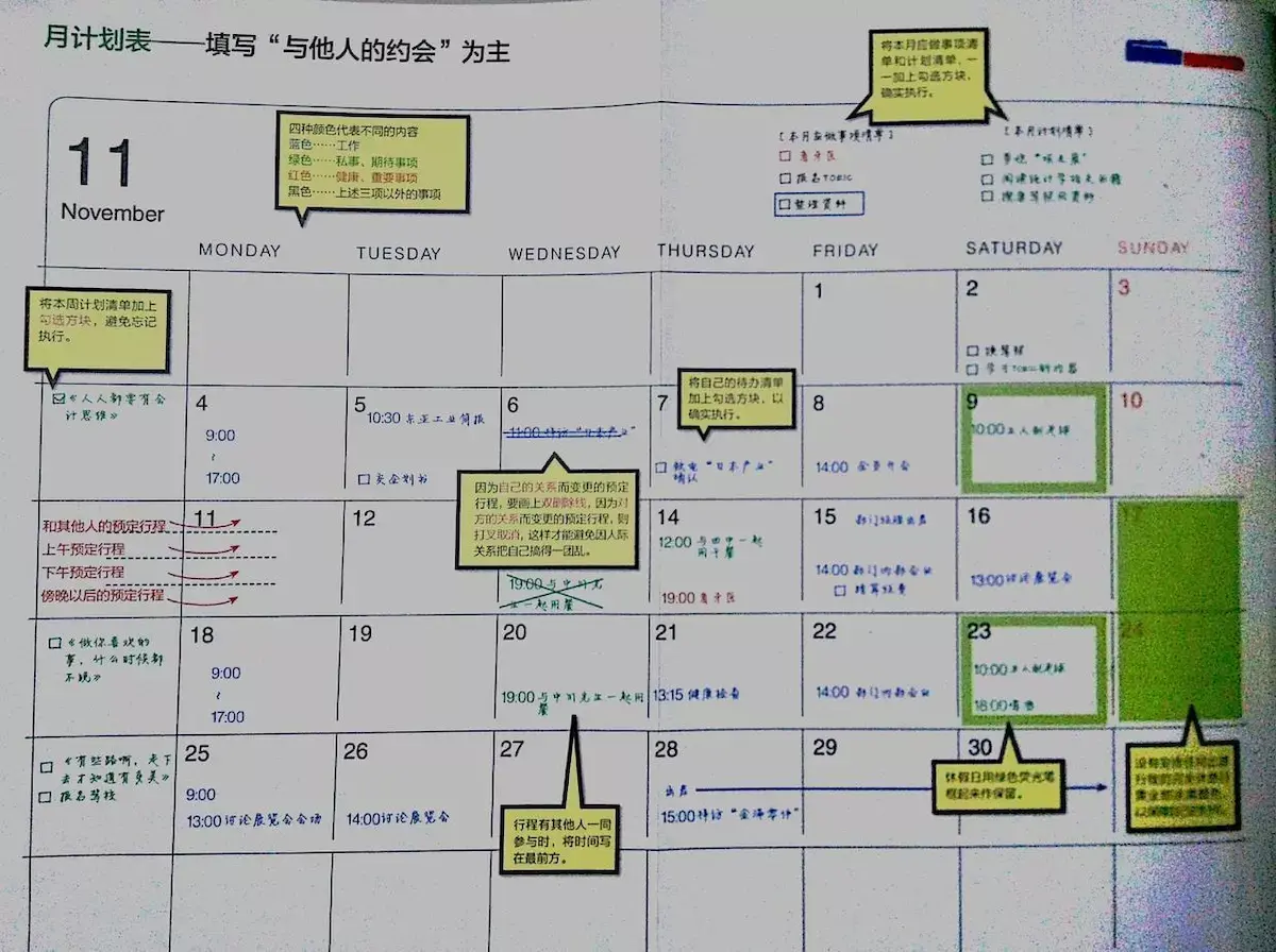 我们还可以准备有四种颜色的笔,来帮忙区分事项,做到一目了然。