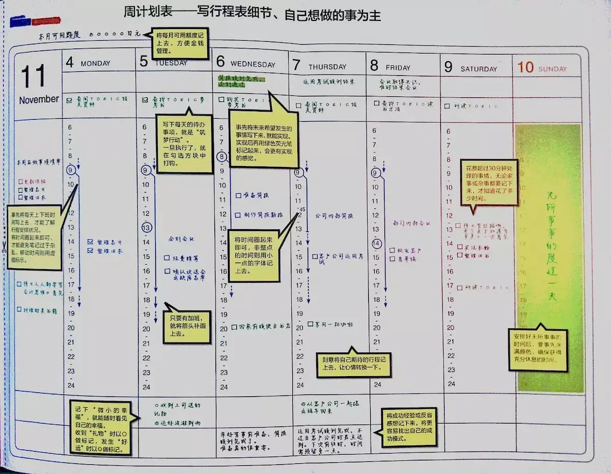 在周计划表中,以填写“自己想做的事”为主,比如这周想读哪本书,完成哪项工作,拜访哪些客户等。