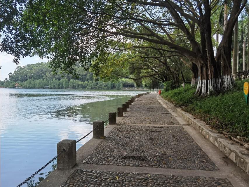 风晨露初,进入虎英郊野公园,便被参天的榕树在环湖路两旁形成的天然树阴包围。站住,一幅山水画的全景图尽收眼底。晨曦下,湖面有船划过,荡起波光粼粼,耳边仿佛响起了熟悉的歌声:“让我们荡起双桨……”此时此景带来的喜悦和激动,让我突然明白了为何虎英公园进夏以来的“禁泳令”一再重申,对游人却不起效果了。