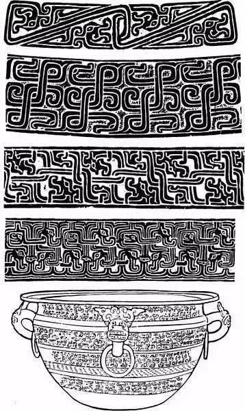 涡纹多装饰在盛放液体的铜器上。该纹饰流行时间很长,从夏代中晚期至春秋战国时期,从未间断过。