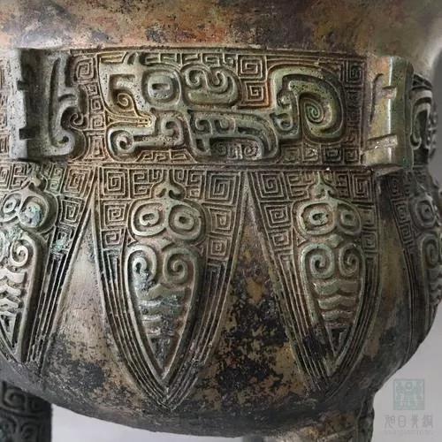 蝉纹:蝉有吸晨露而洁净的天性,餐风饮露,品性高洁,是古人心目中神秘而圣洁的灵物,寓意吉祥。青铜器的蝉纹最早出现于商代,盛行于商末周初,主要装饰在鼎沿下、爵的管状流和卣、壶等器物的提梁上。